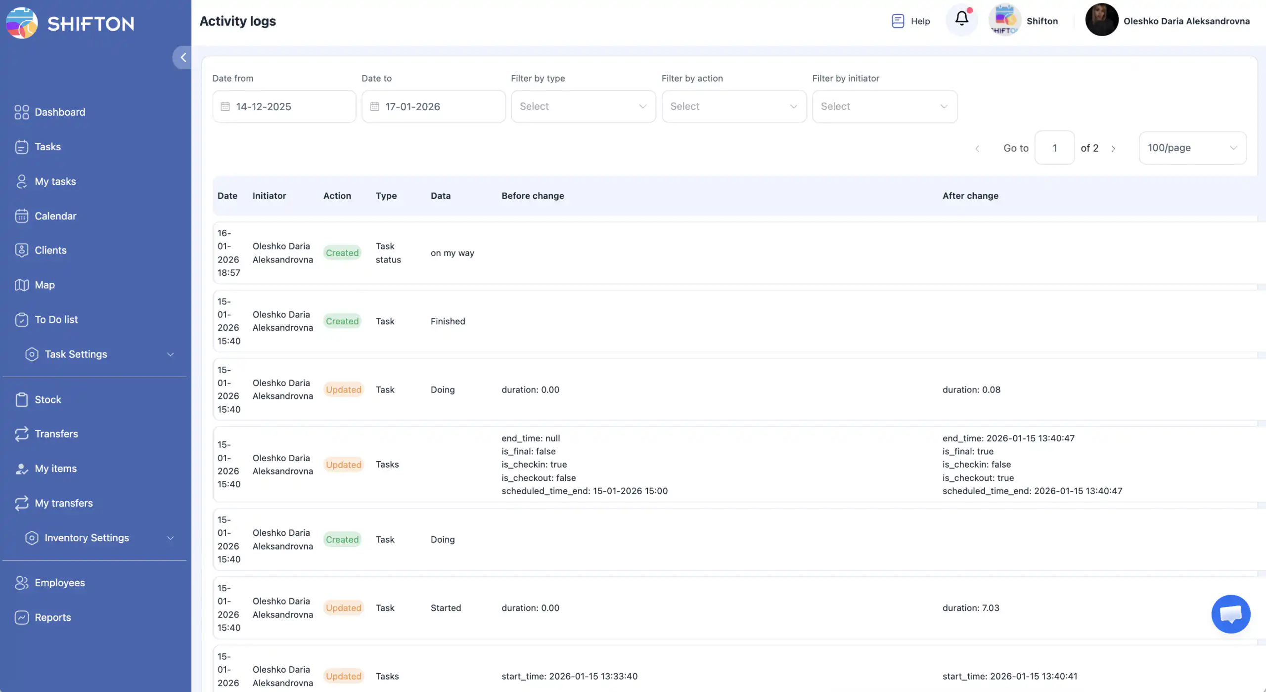 该活动日志部分允许您查看在任何选定时间段内公司内执行的所有操作。这有助于您监控系统更改、跟踪员工活动,并分析操作历史。