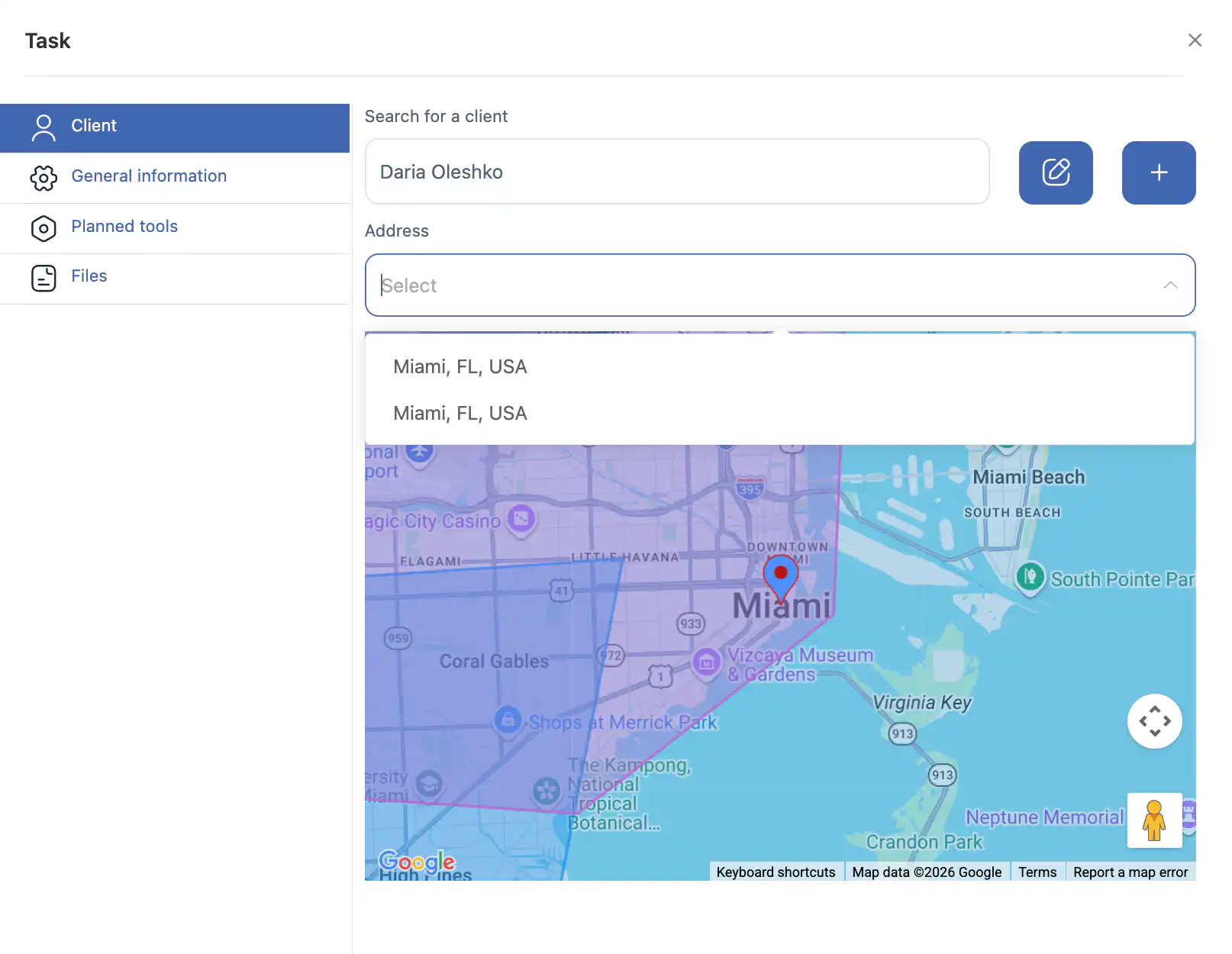 提示: 始终仔细检查所选的客户和地址,尤其是在客户有多个地址时,以避免错误分配任务。