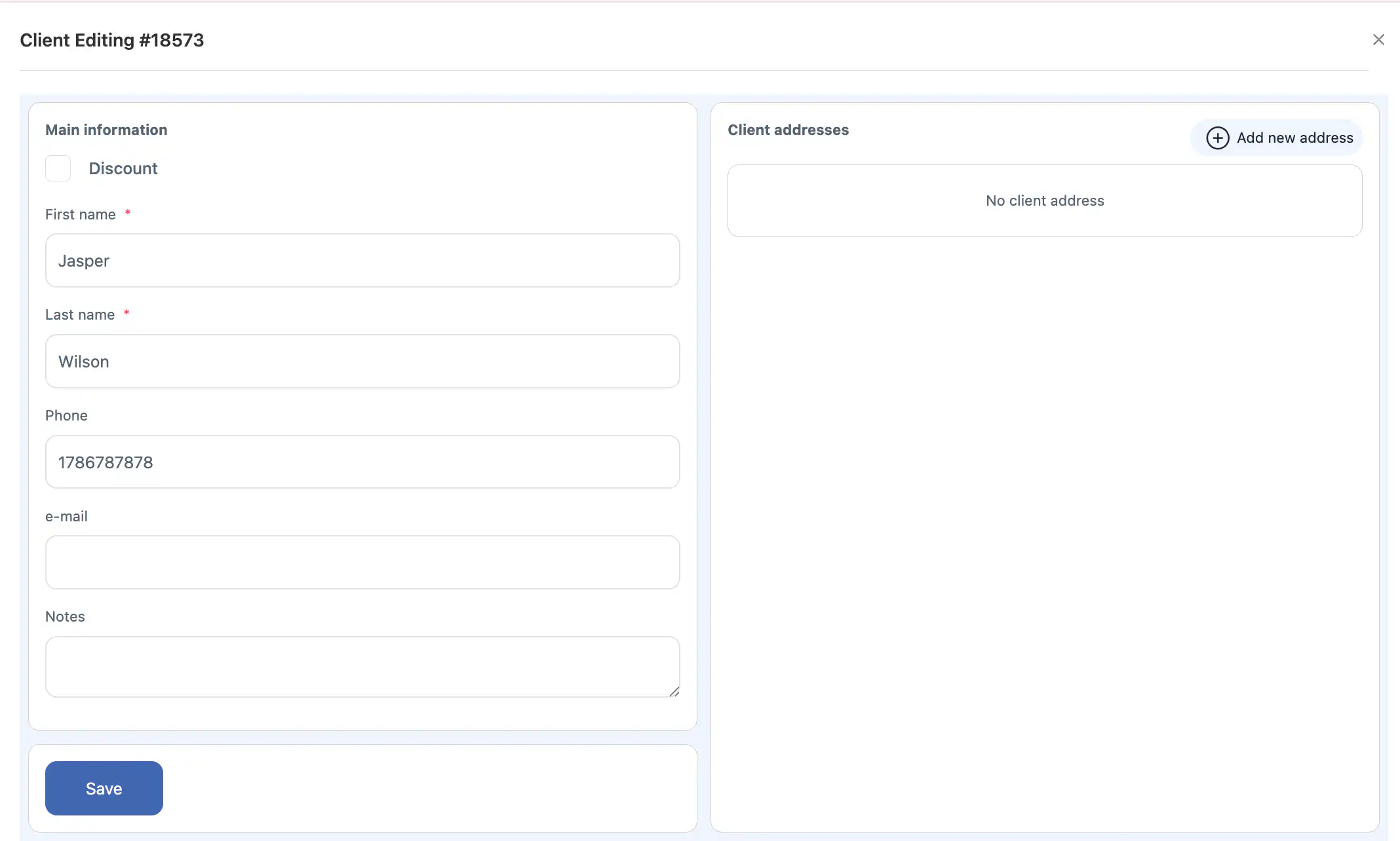 要创建新客户,请点击加号图标→ 填写必填字段 →保存.