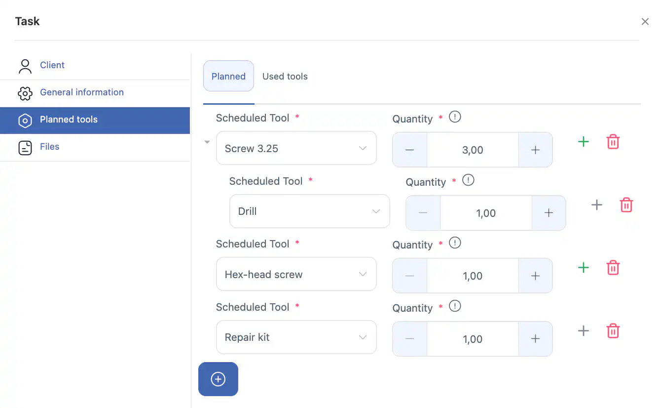 指定完成任务所需的工具、设备或耗材(需要库存模块)。