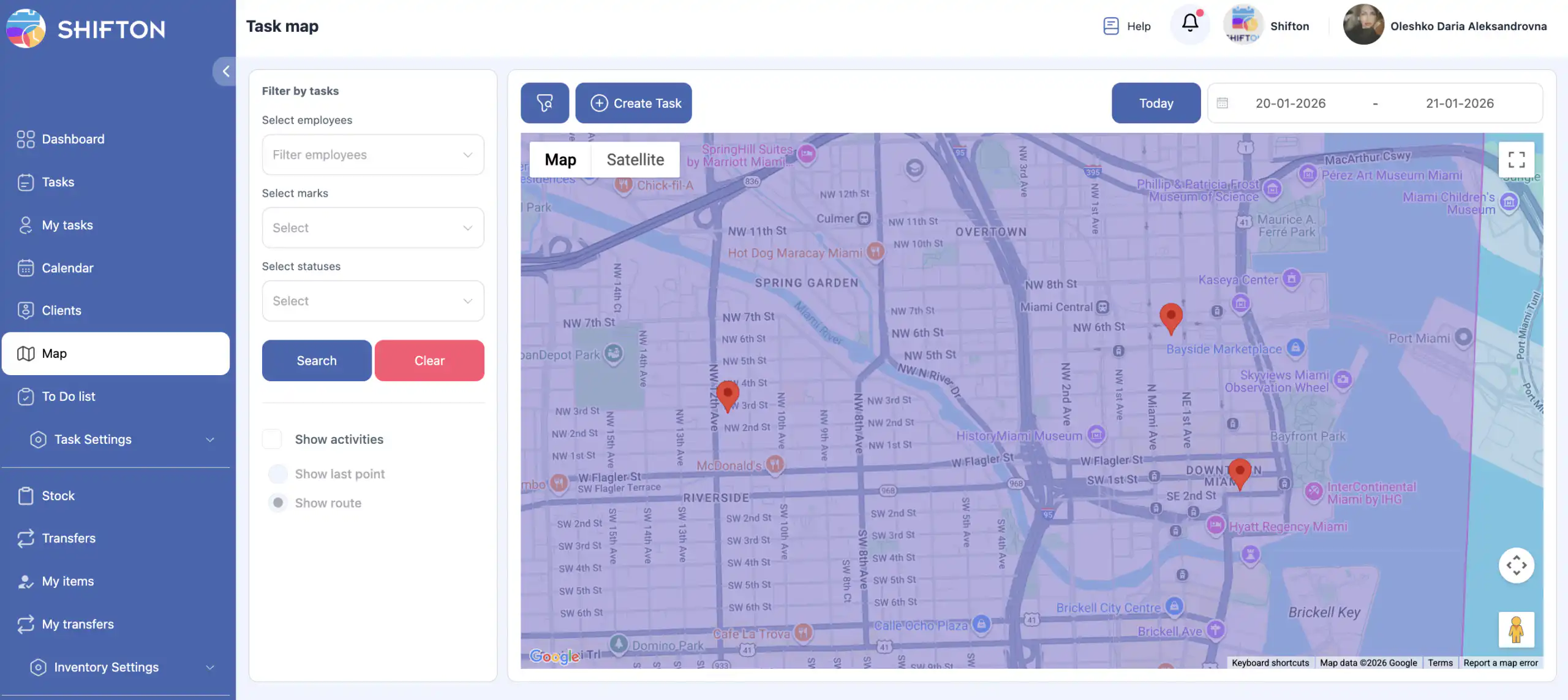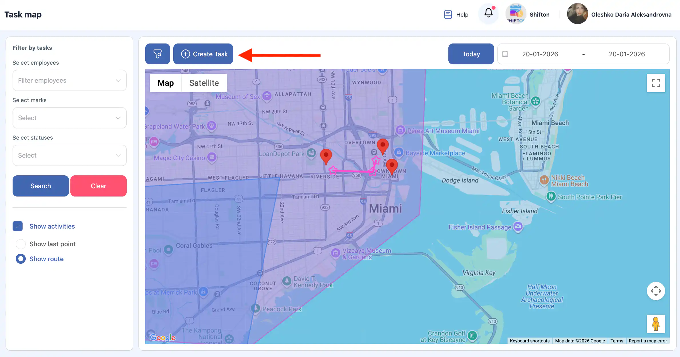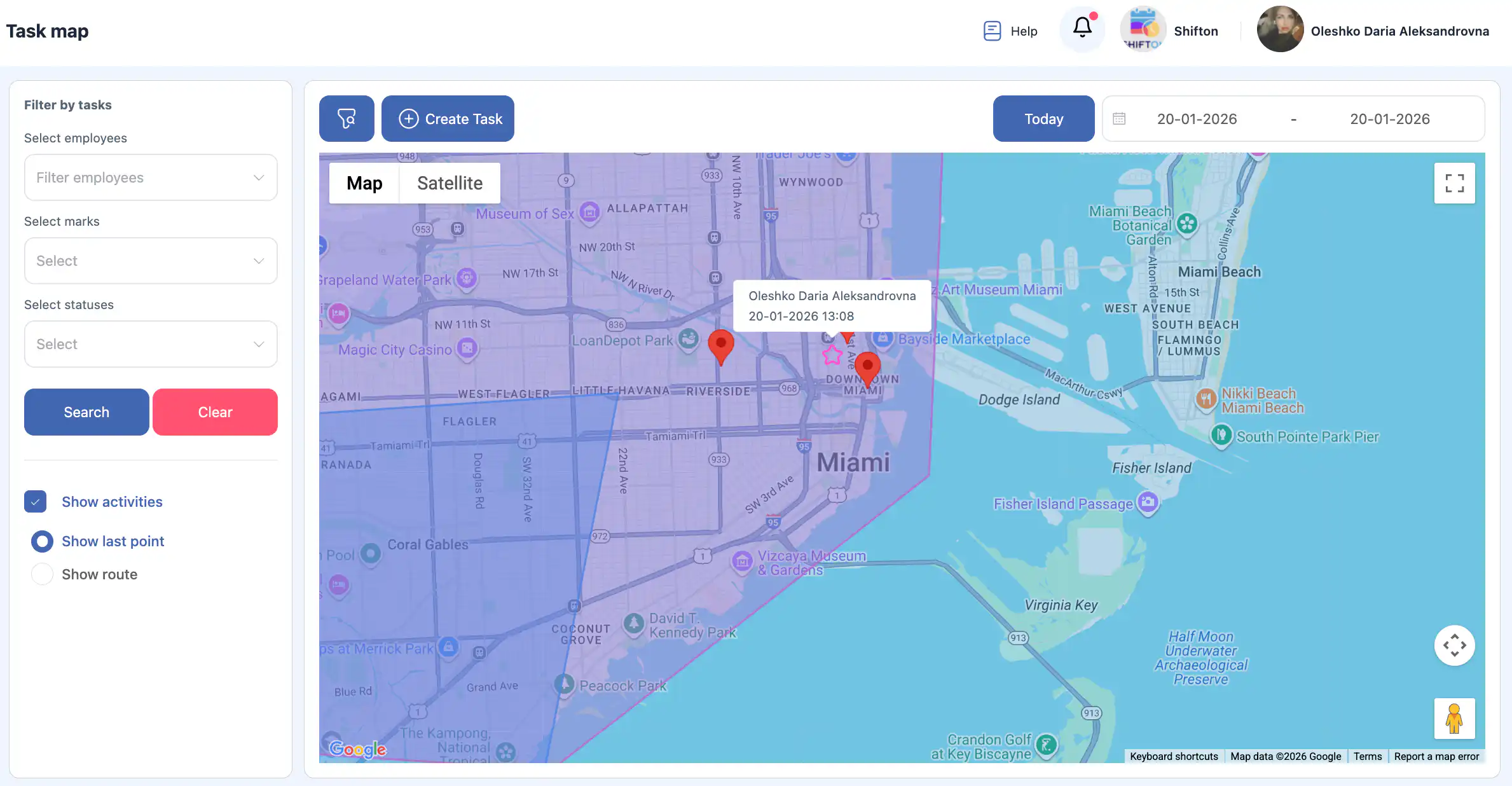 答:在侧边菜单中选择“地图”。这将打开带有任务和员工跟踪功能的地图界面。