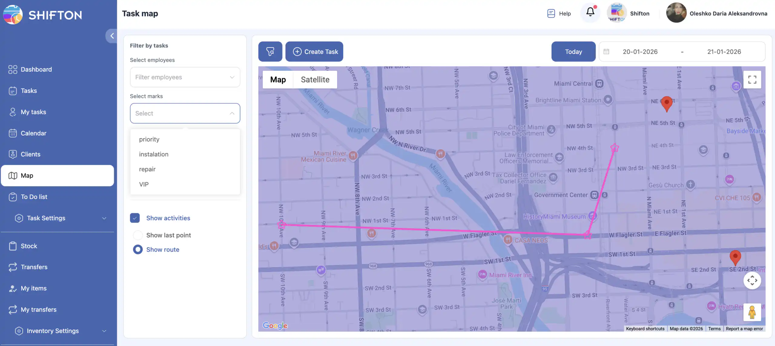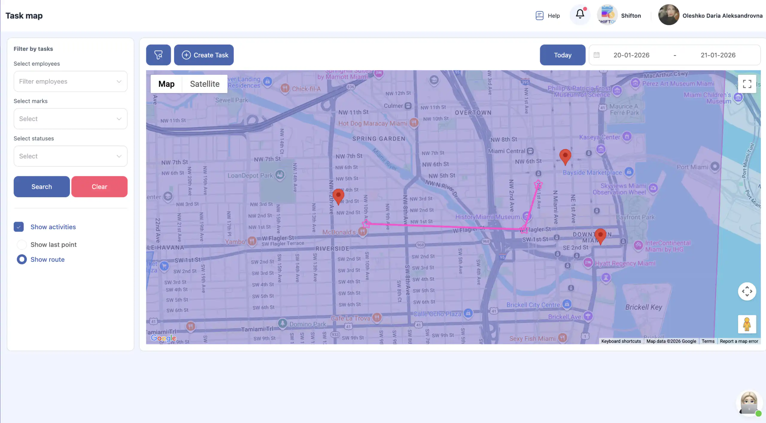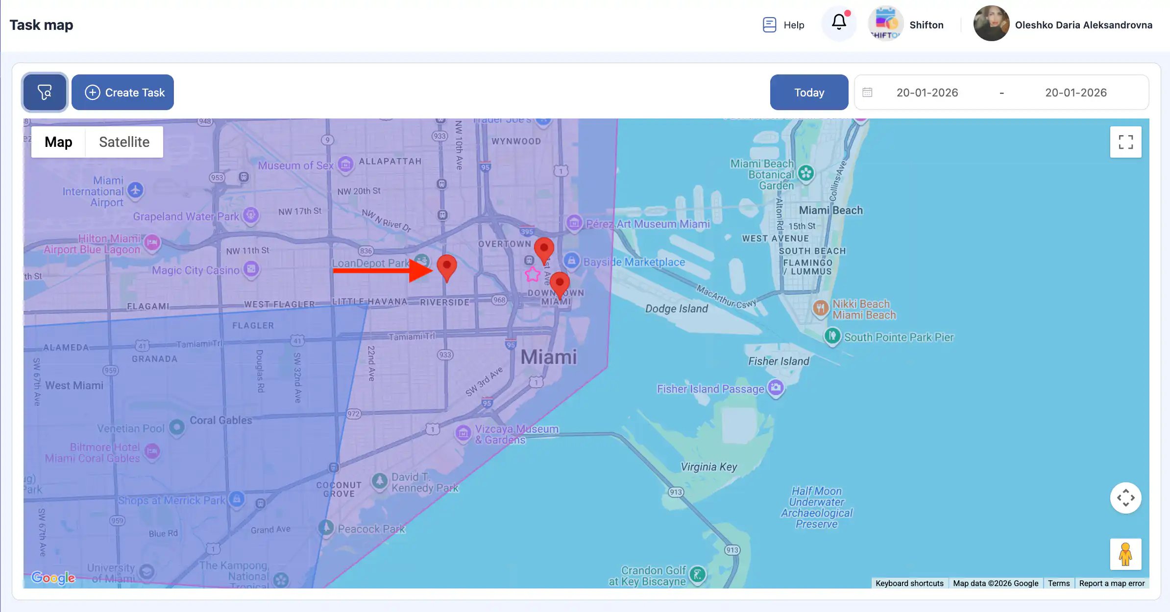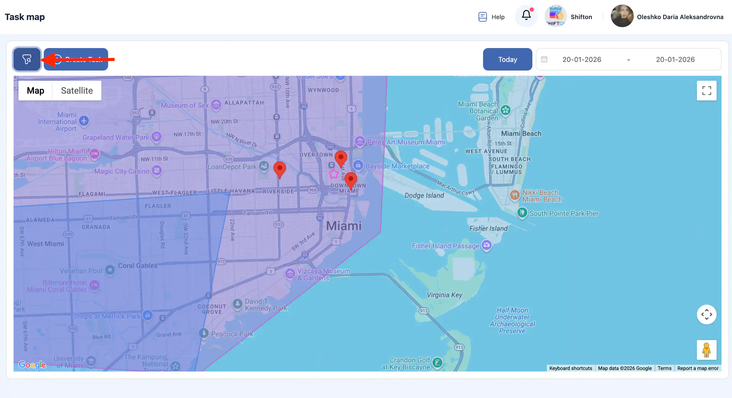 答:在侧边菜单中选择“地图”。这将打开带有任务和员工跟踪功能的地图界面。
