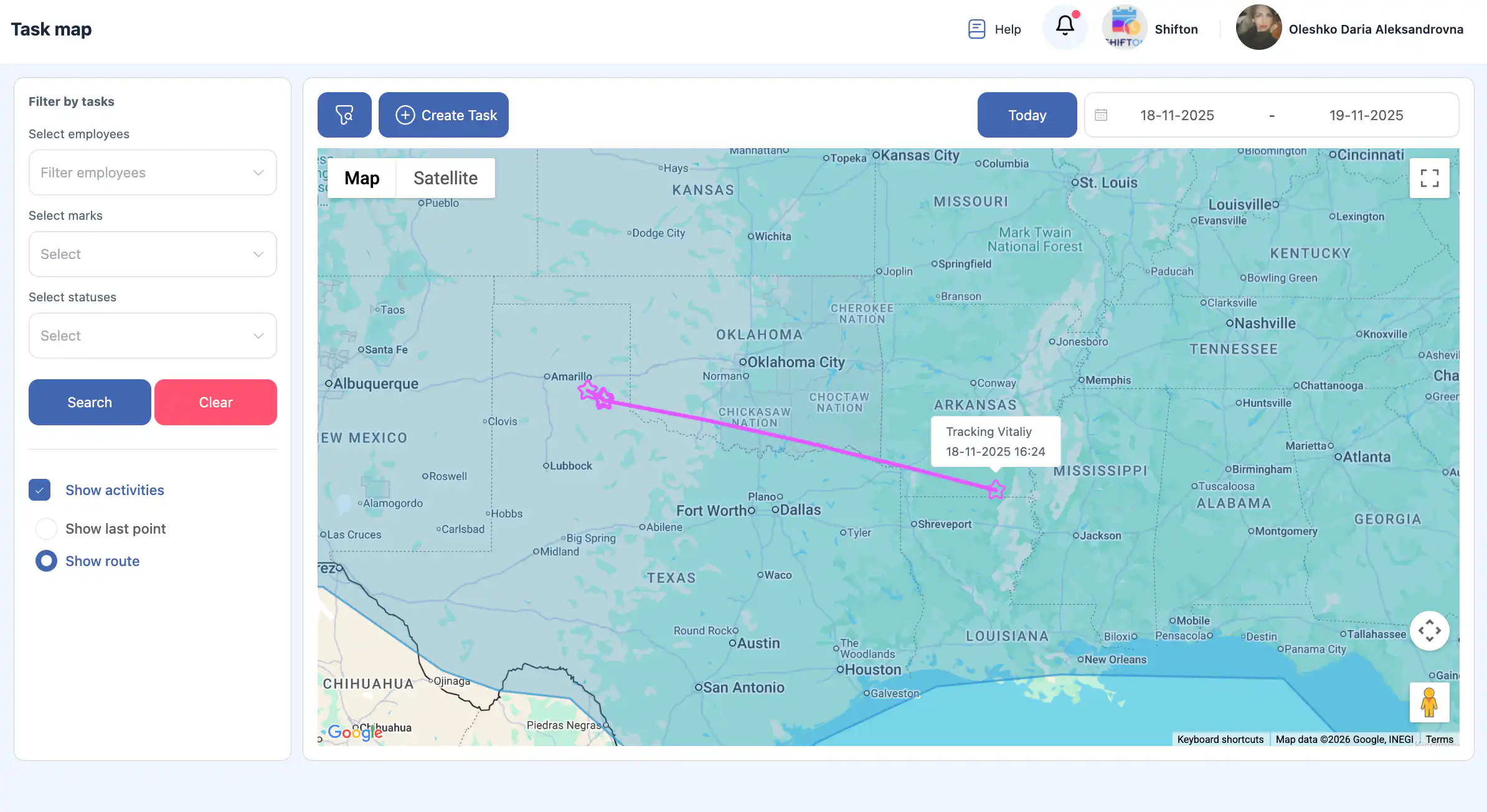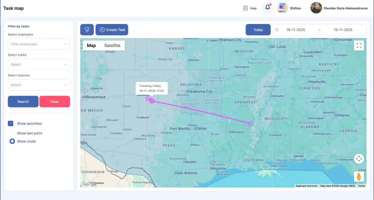 答:在地图部分,您可以在地图上查看任务、创建任务(如果存在带有地址的客户)、实时跟踪员工的移动,以及查看员工在任意选定时间段内的路线历史。