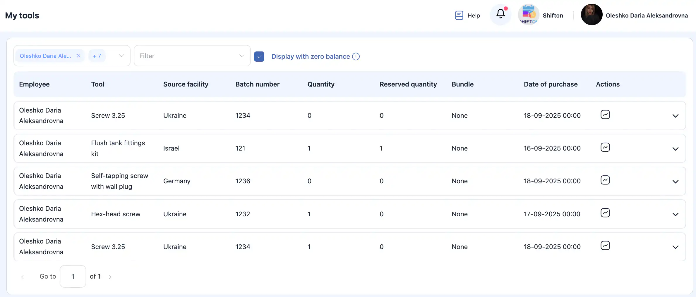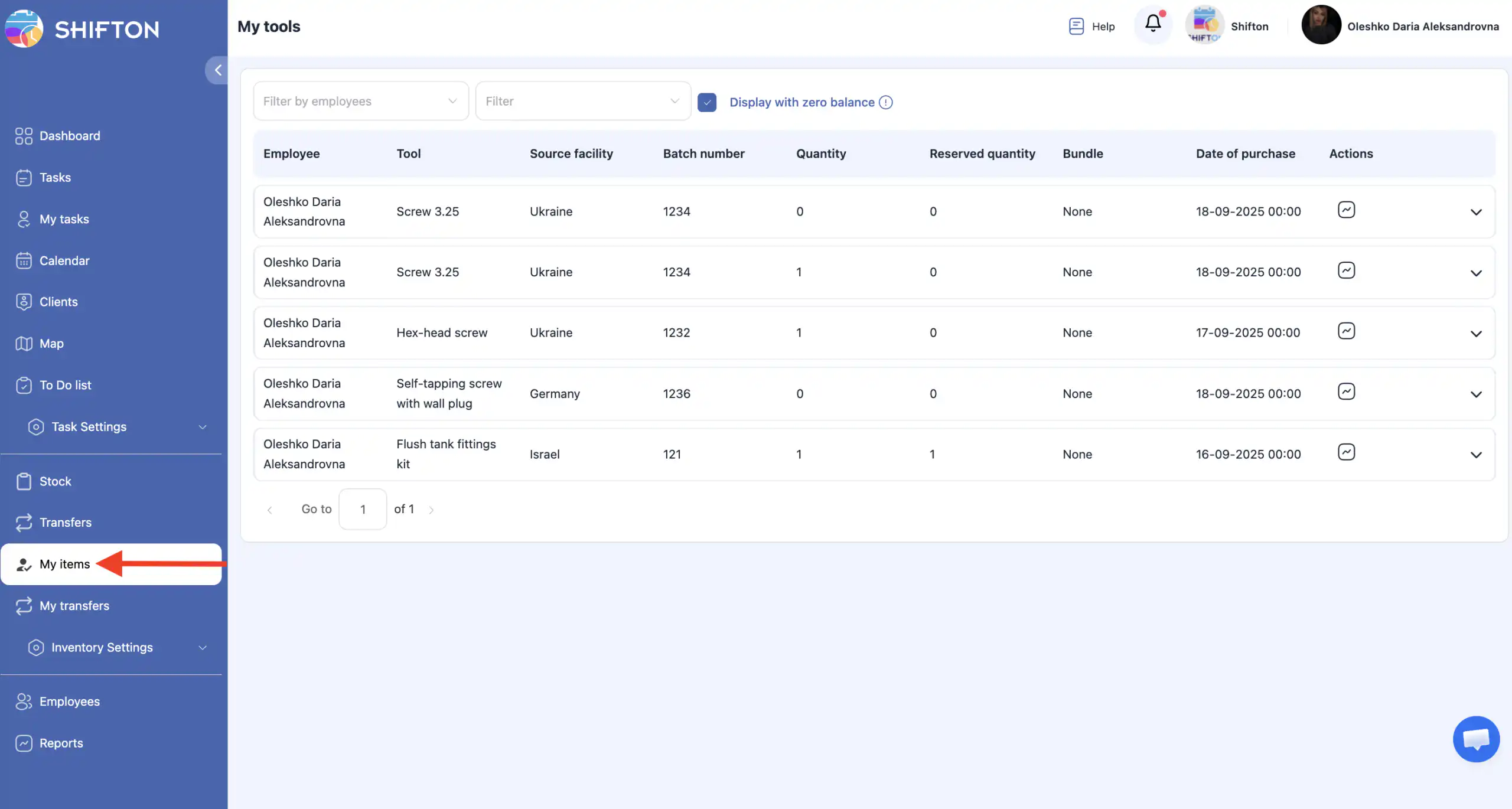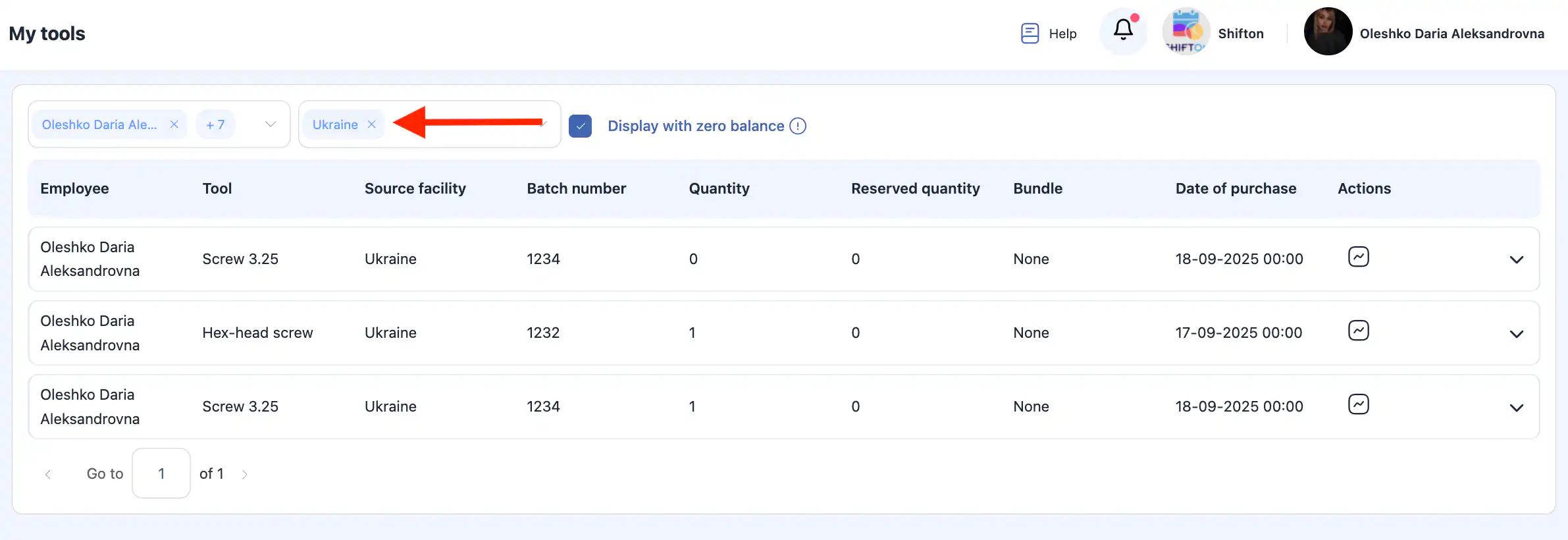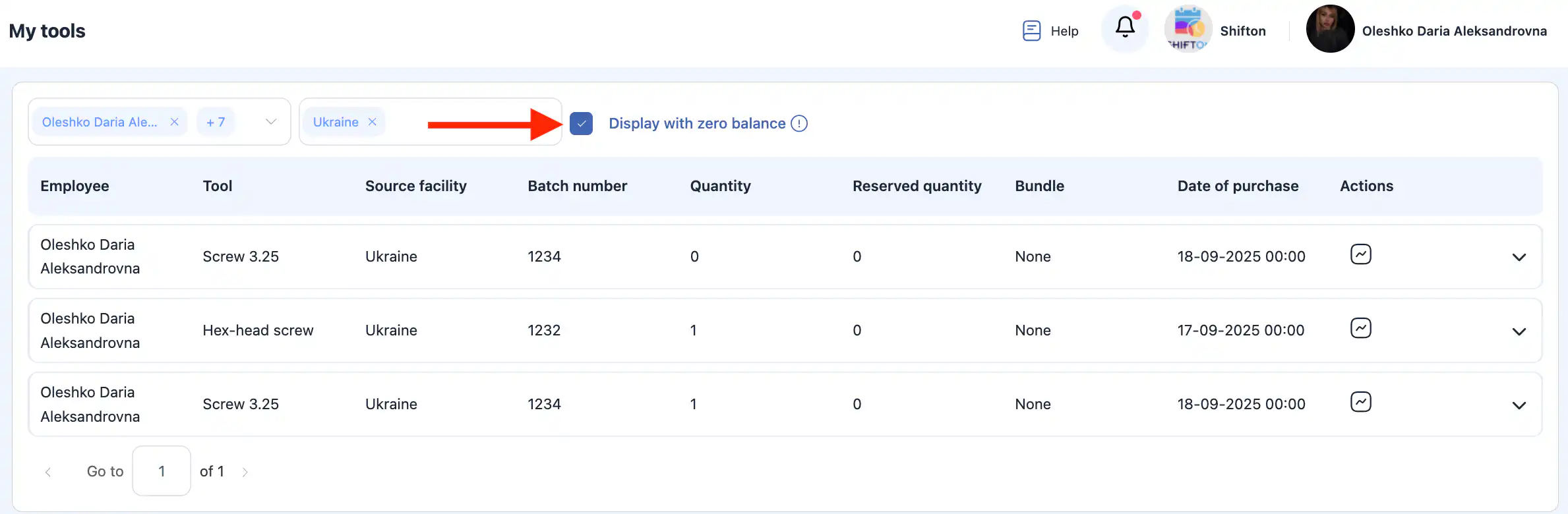 “显示余额为零的工具”选项允许您查看:以前分配给技术人员的工具;