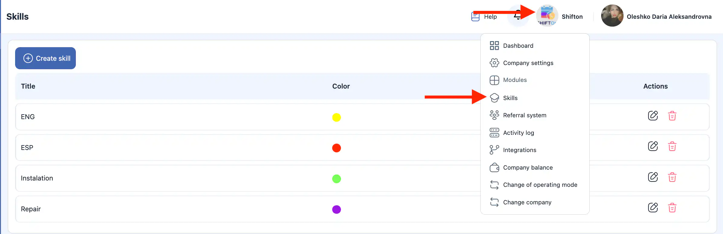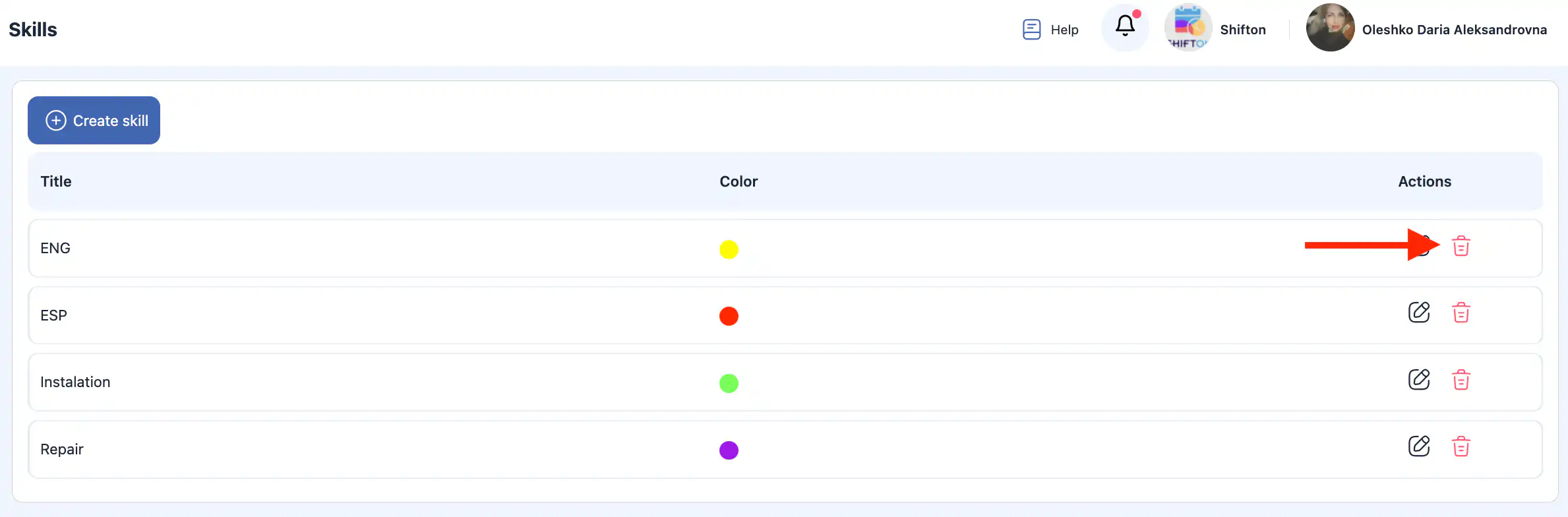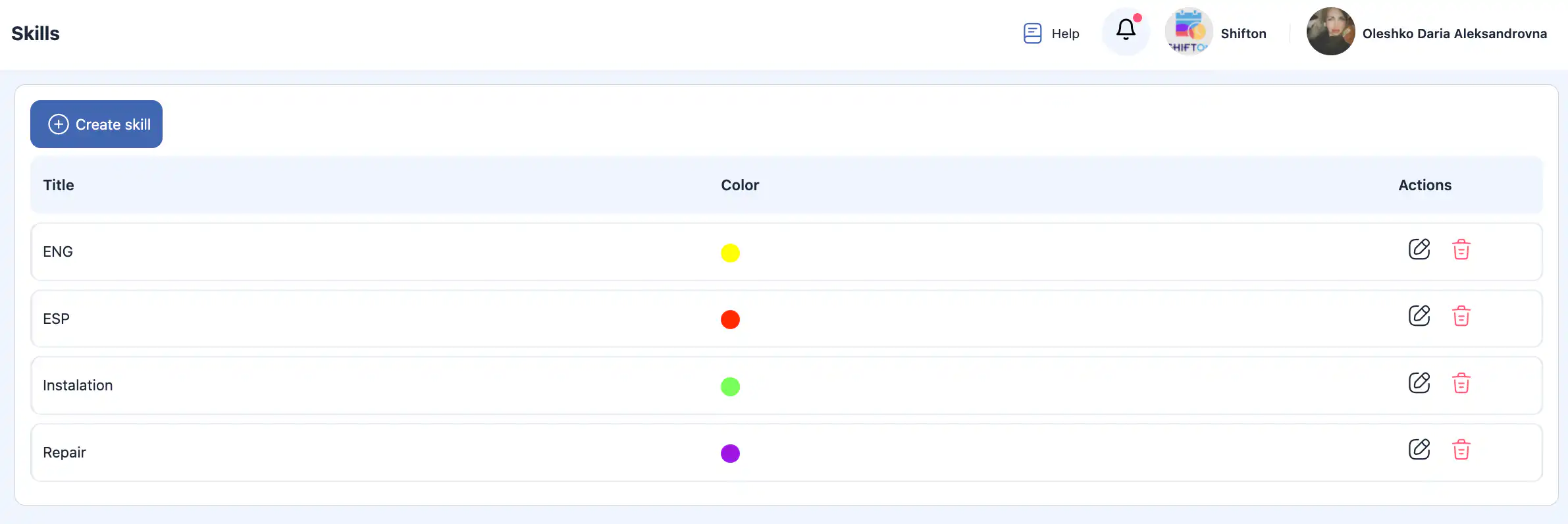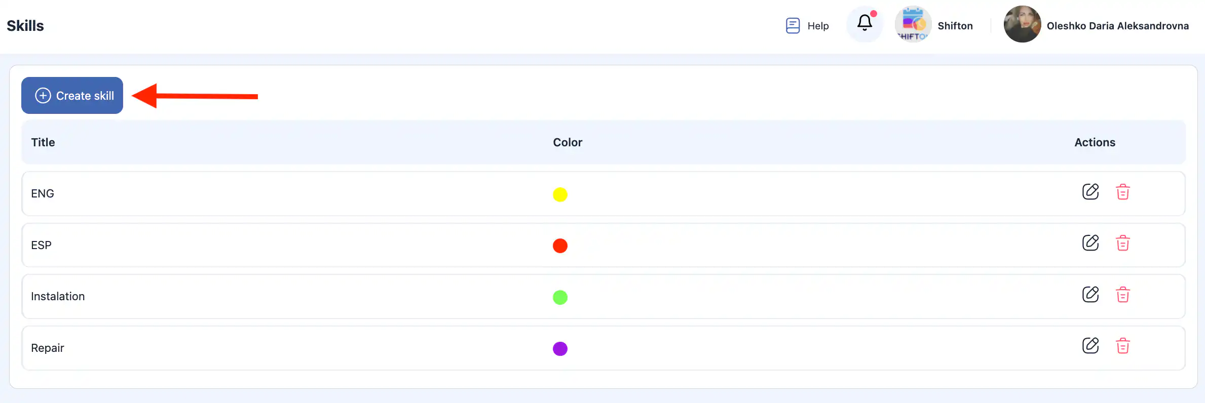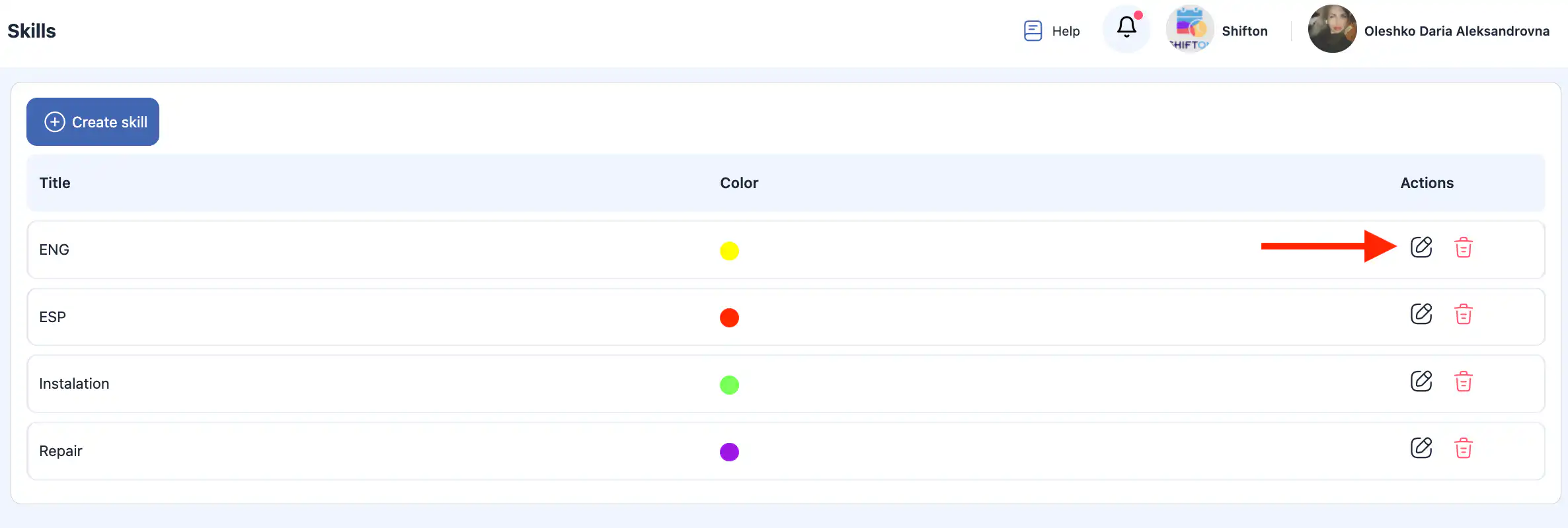 答:点击您想编辑的技能旁的铅笔图标,在侧边栏中更新名称或颜色,然后点击 “保存。”