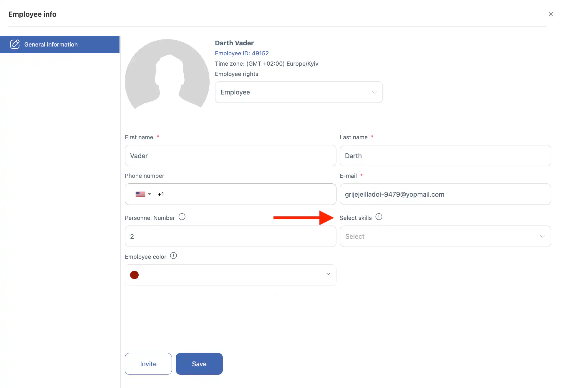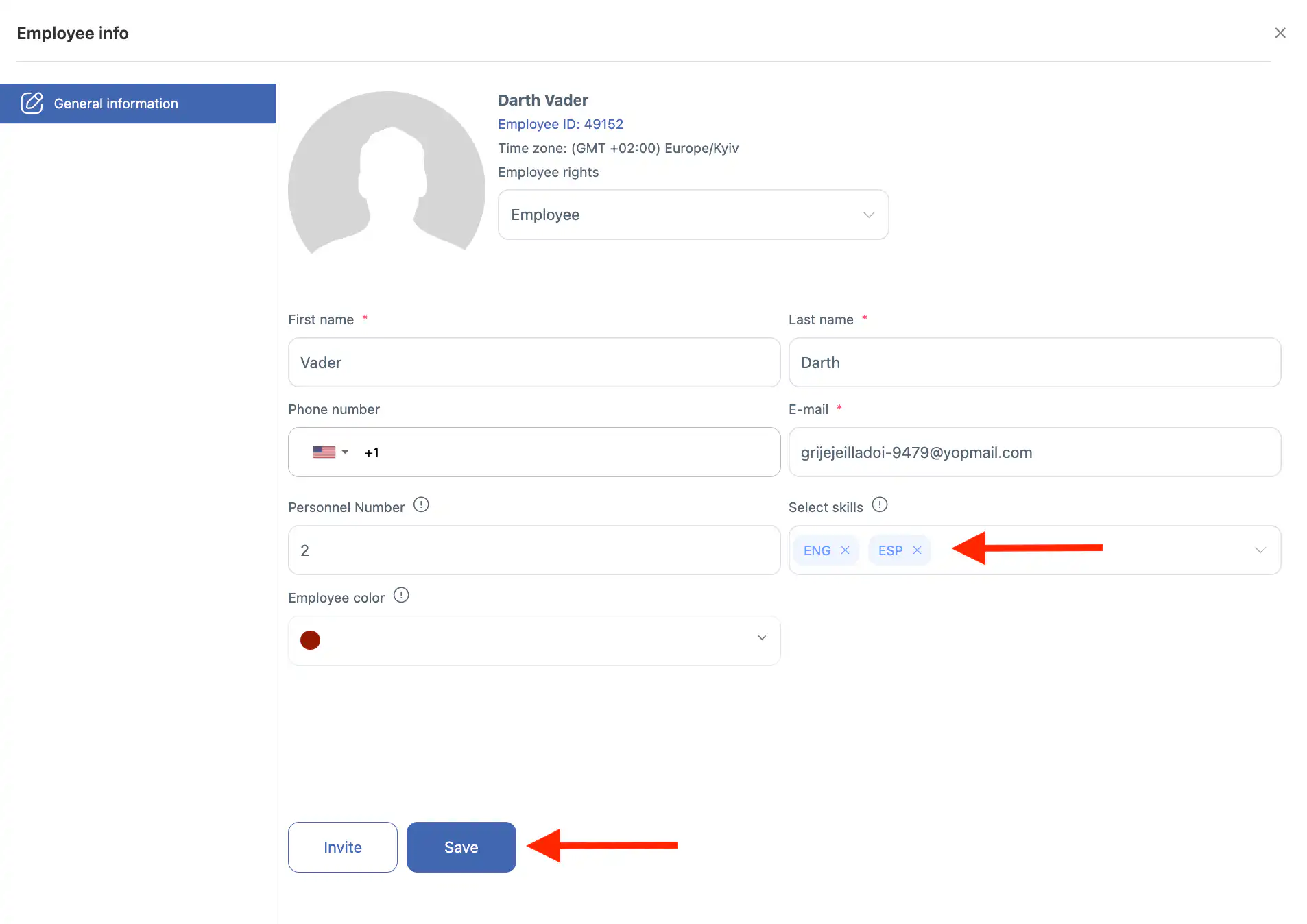 答:进入员工部分(人员图标),点击员工旁的铅笔图标,使用“选择技能”字段添加一个或多个技能,然后点击“保存。”
