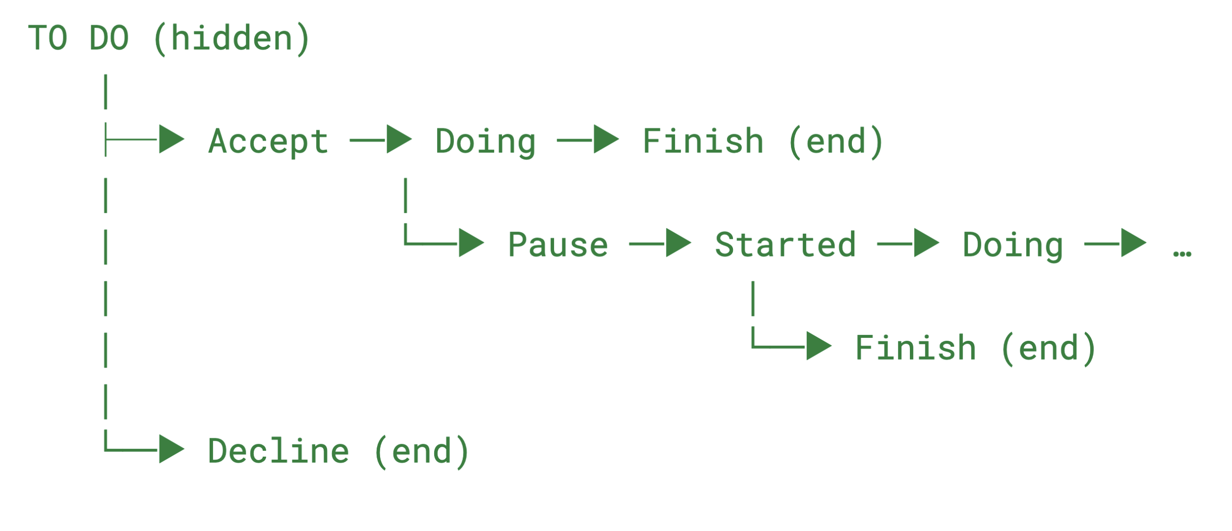 答: 一个扩展的工作流程示例如下:TO DO → Accept → Doing → (Pause) → Finish,反映了接受、执行、暂时停止和完成。