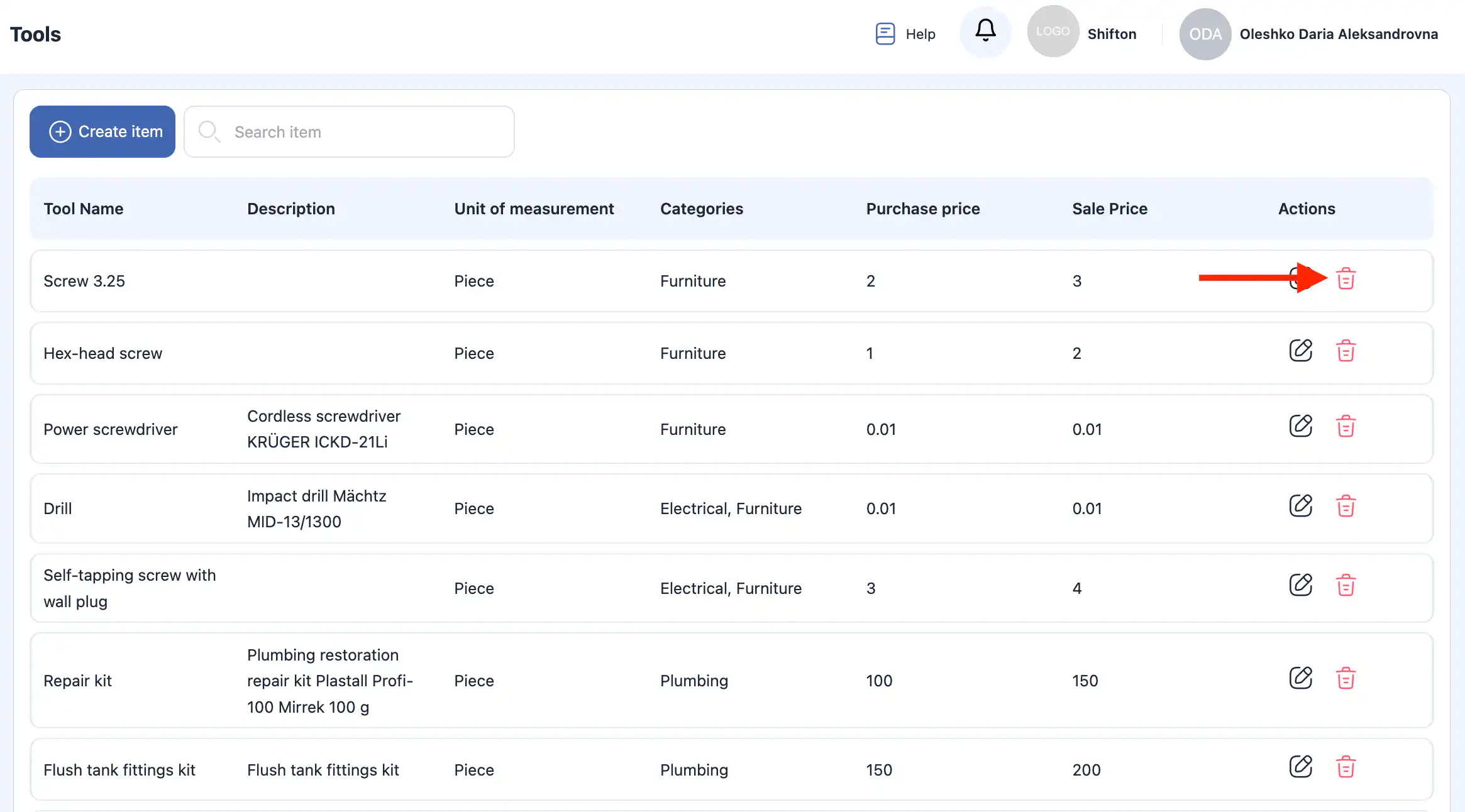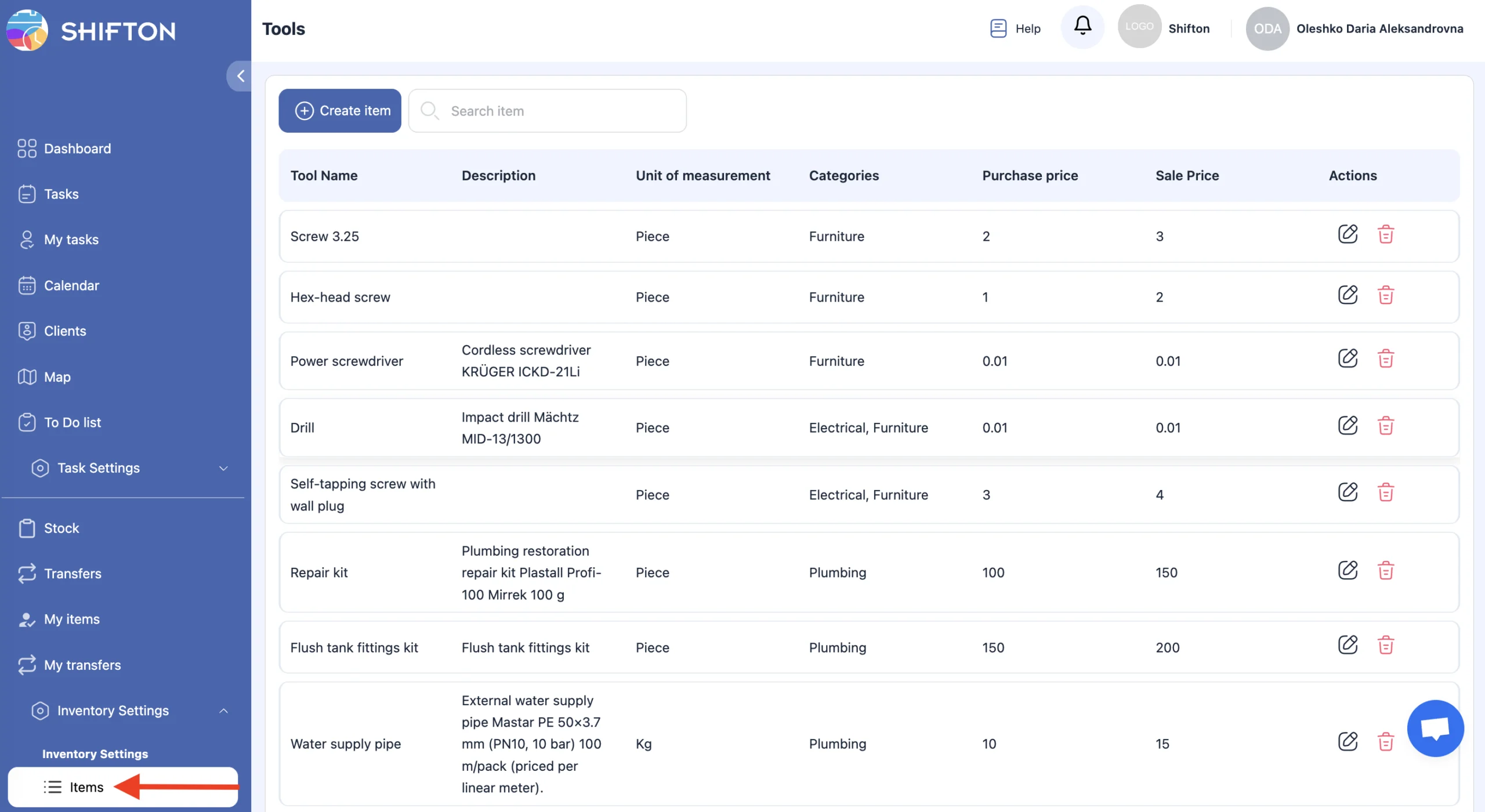 A: 点击铅笔图标在工具旁边,在侧面面板中更新信息(名称、类别、单位、价格、相关工具、选项),然后点击保存。