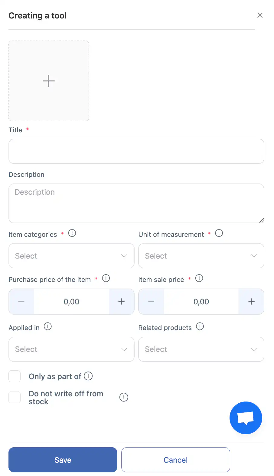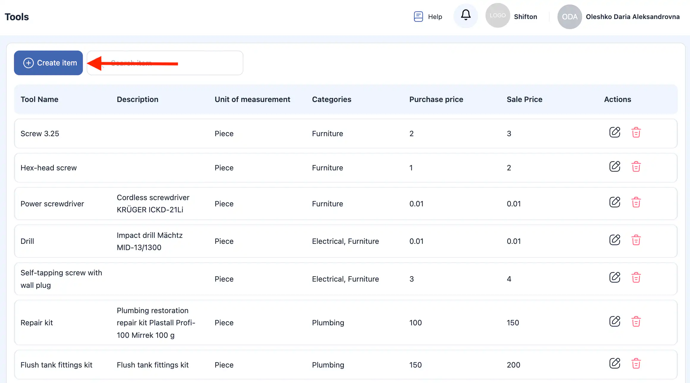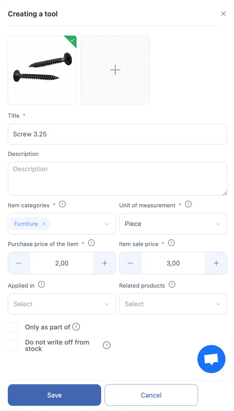 A: 点击“创建工具”,输入工具名称,可选地添加描述,分配一个或多个类别,选择或创建一个计量单位,设置购买和销售价格,并在需要时添加相关工具。然后点击保存。.