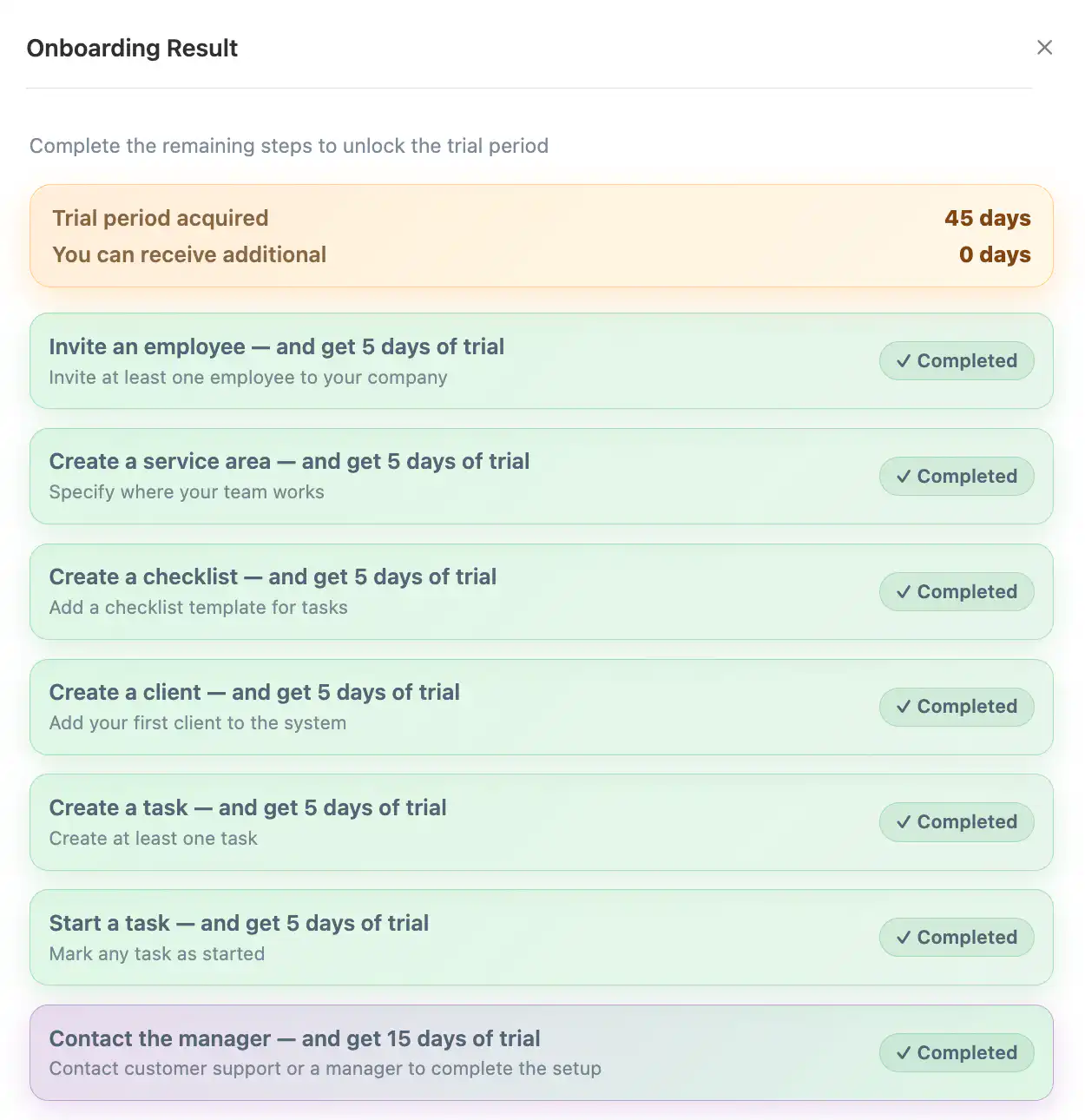 完成任务后,该任务将被标记为已完成,并在试用面板中显示获得的天数。
