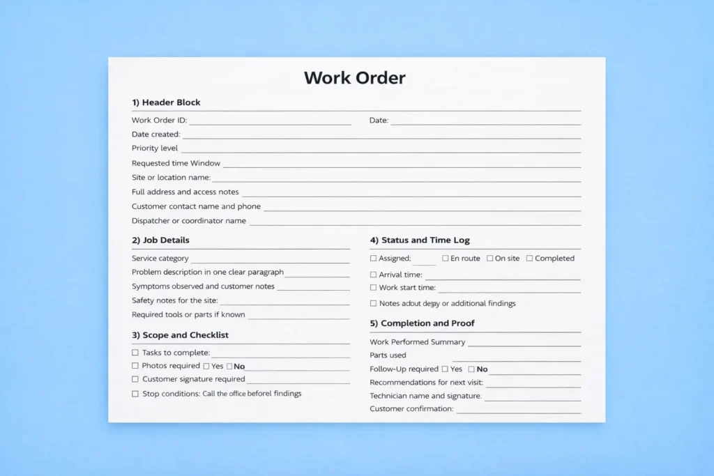 Мақсат — ұзақ құжат жазу емес. Мақсат — орналасу, қолжетімділік ескертпелері, жұмыс түрі, басымдық және аяқталу өлшемі сияқты негізгі ақпаратты өткізіп алуды қиындату. Осыған қол жеткізсеңіз, қайталама барулар азаяды, контексттің жетіспеуінен болатын кідірістер азаяды және жаңарту сұраған клиент қоңыраулары сирейді.